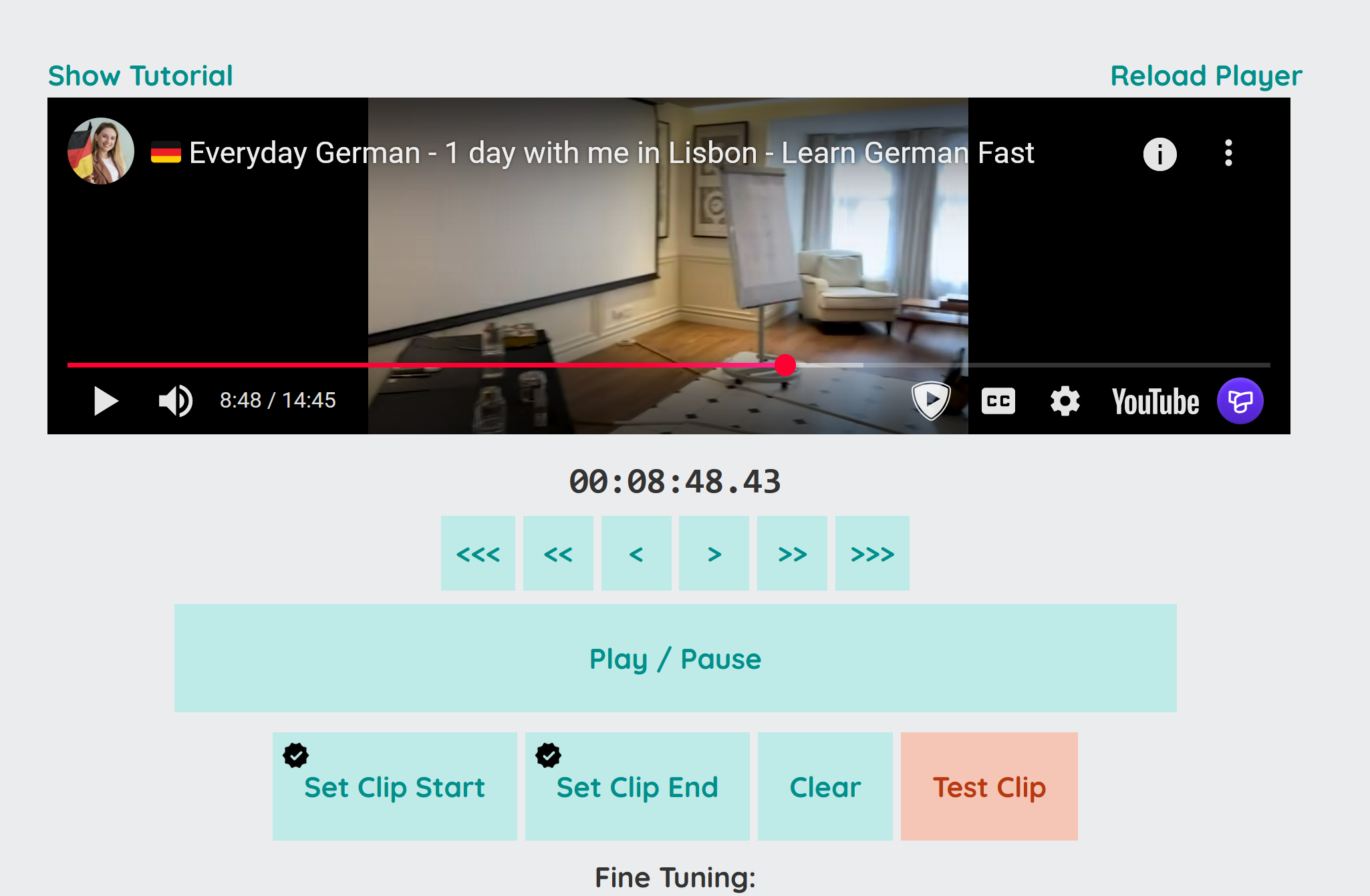 Next, use the built-in clip selector to set the beginning and end of your clip! Try not to choose sentences that are super long; the best clips are less than 5 seconds long. Once you have a clip you’re happy with, you can save it and start using it for chorusing!