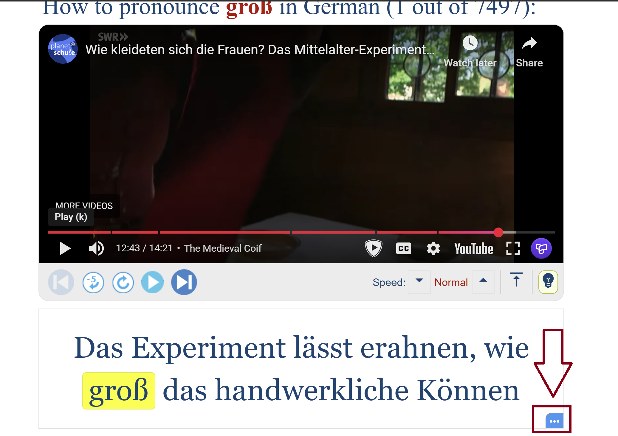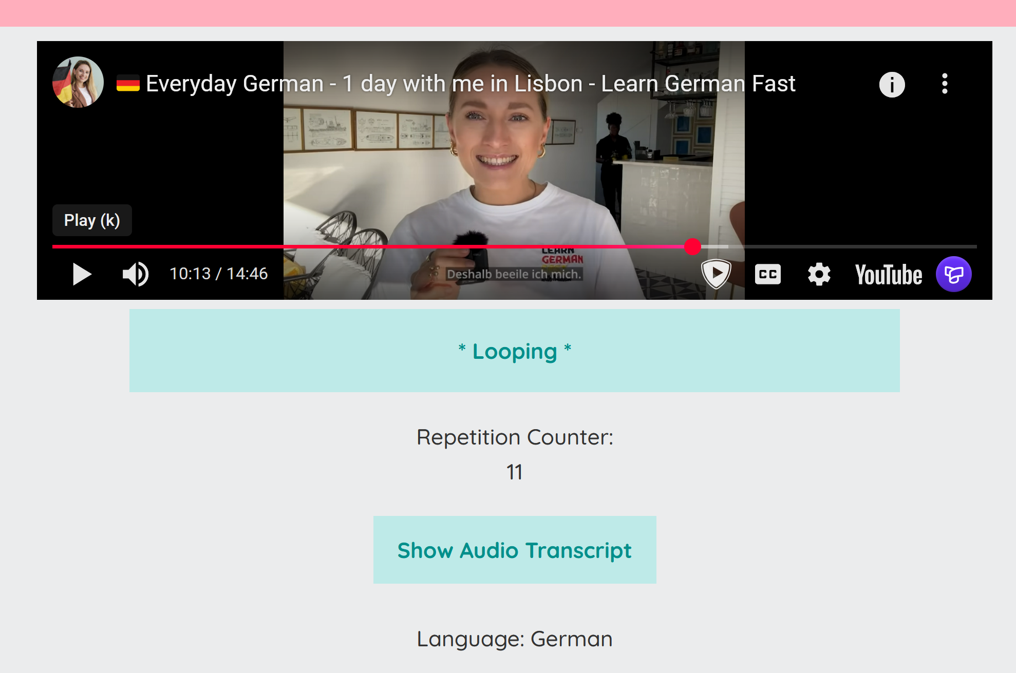 Once you have Trancy installed, you will see a little purple “T” appear in the bottom right corner of any supported videos. For shadowing, it’s best to start by using comprehensible input videos made for German learners. Some great channels for this are Deutsch mit Lari, eleos corner, NITA Study German Daily, Dein Sprachcoach, and Learn German Fast. As you get better, you can use any native speaker’s videos for shadowing practice!