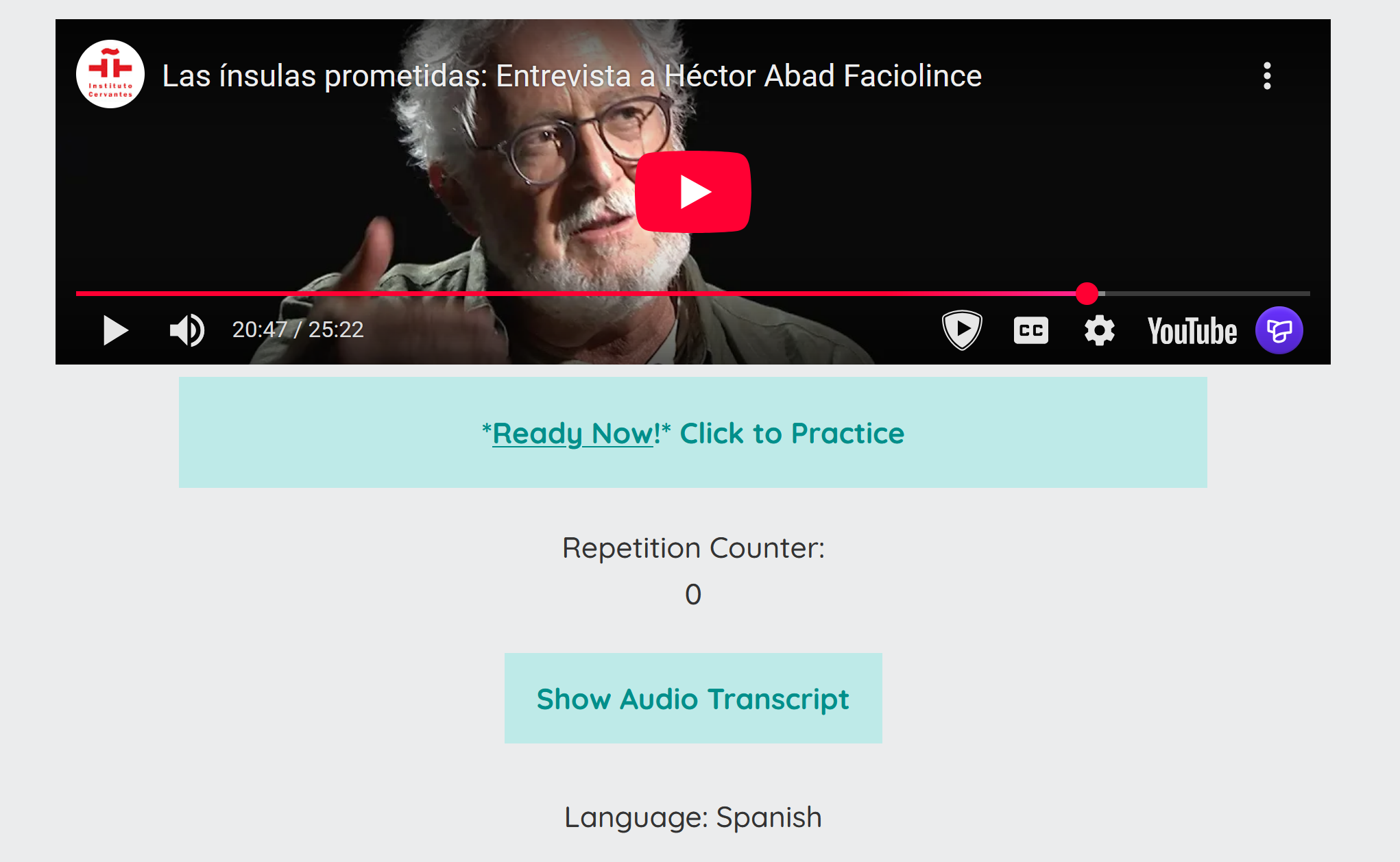 After you select a clip you want to practice, you will see the original video it comes from. When you press “Ready Now,” the clip will start playing on a loop. For the first few loops, just listen to the sentence, focusing on the native speaker’s flow and pronunciation.
