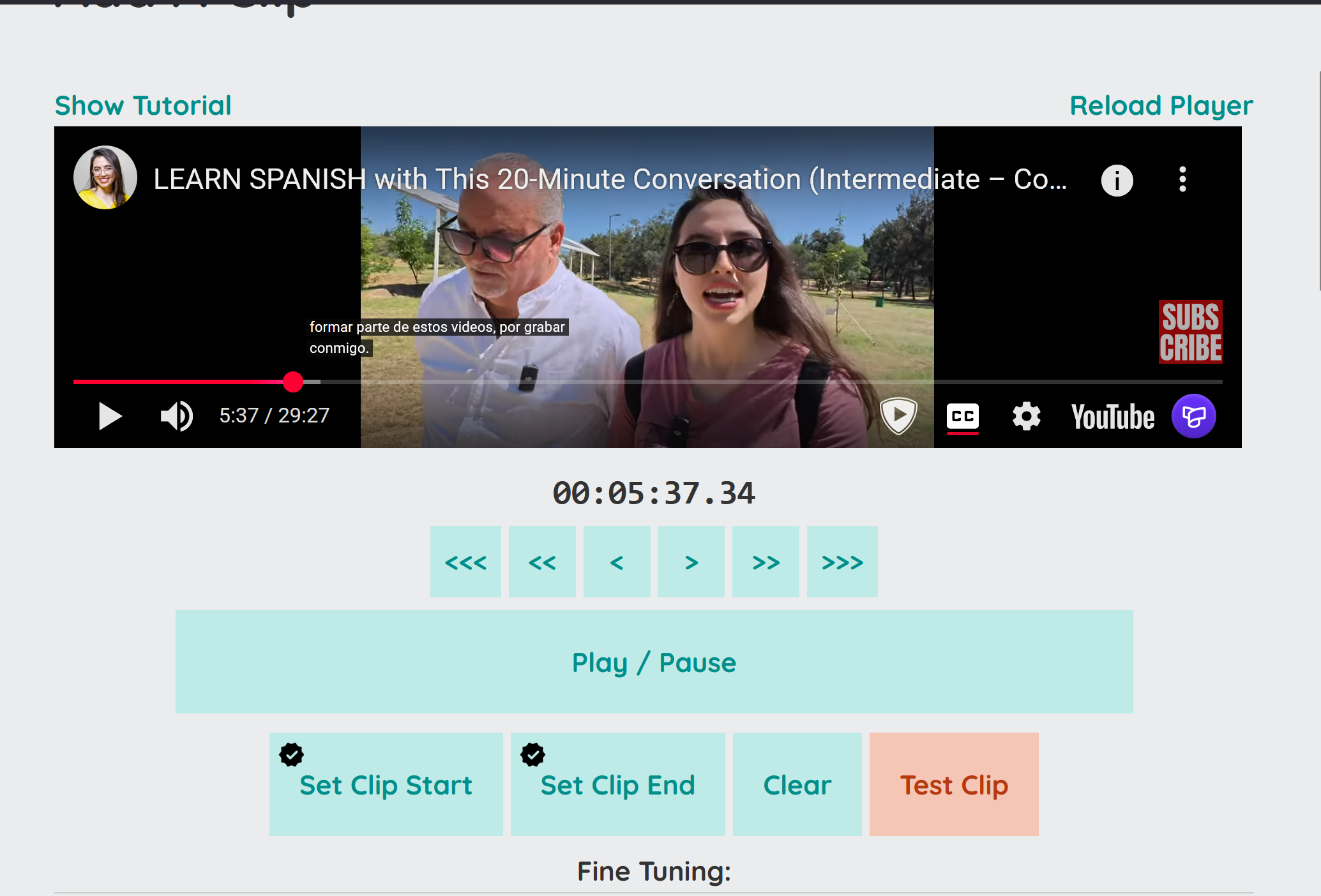 Next, use the built-in clip selector to set the beginning and end of your clip! Try not to choose sentences that are super long; the best clips are less than 5 seconds long. Once you have a clip you’re happy with, you can save it and start using it for chorusing!