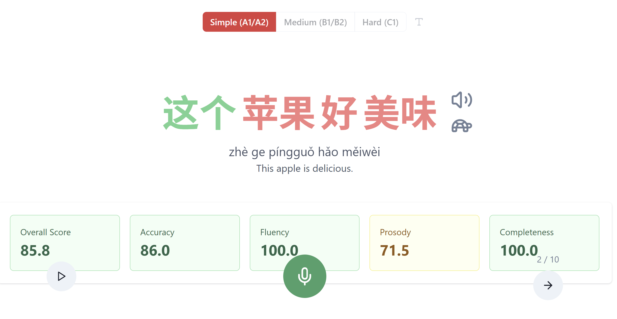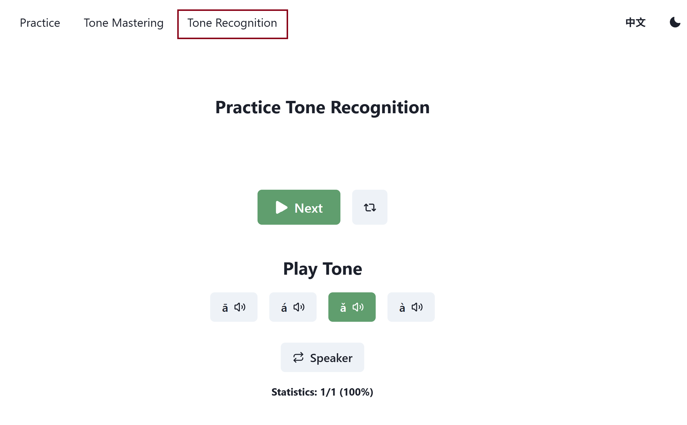 If you’re already familiar with the four tones of Chinese, then you can switch to focusing on being able to say them yourself. That’s where the “Tone Mastering” game comes in handy! In this game, you will be given a word to say, then you will record yourself using the green record button at the bottom center of the screen. If you need to hear how the word is pronounced, you can click on the speaker button on the bottom left side.