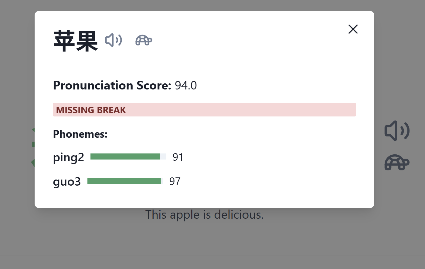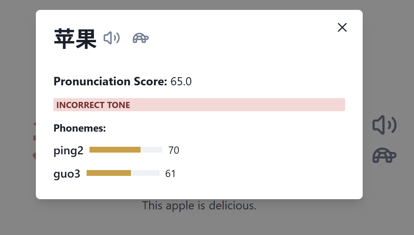 To see more details about how you pronounced a word, either hover over it or click on it. Here, you can see that I pronounced the tone of this word incorrectly. In that case, I would repeat the sentence, focusing on improving my tones. If your pronunciation or tone is incorrect, you should always try to say the sentence again correctly. However, if you’re really struggling with a specific word even after practicing it a few times, it’s best to move on to a different sentence and come back to it later.