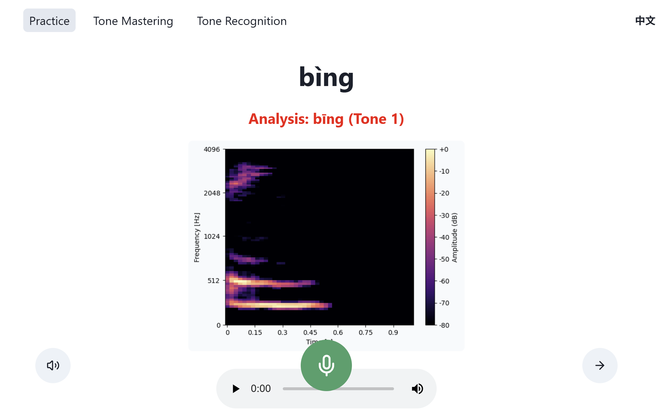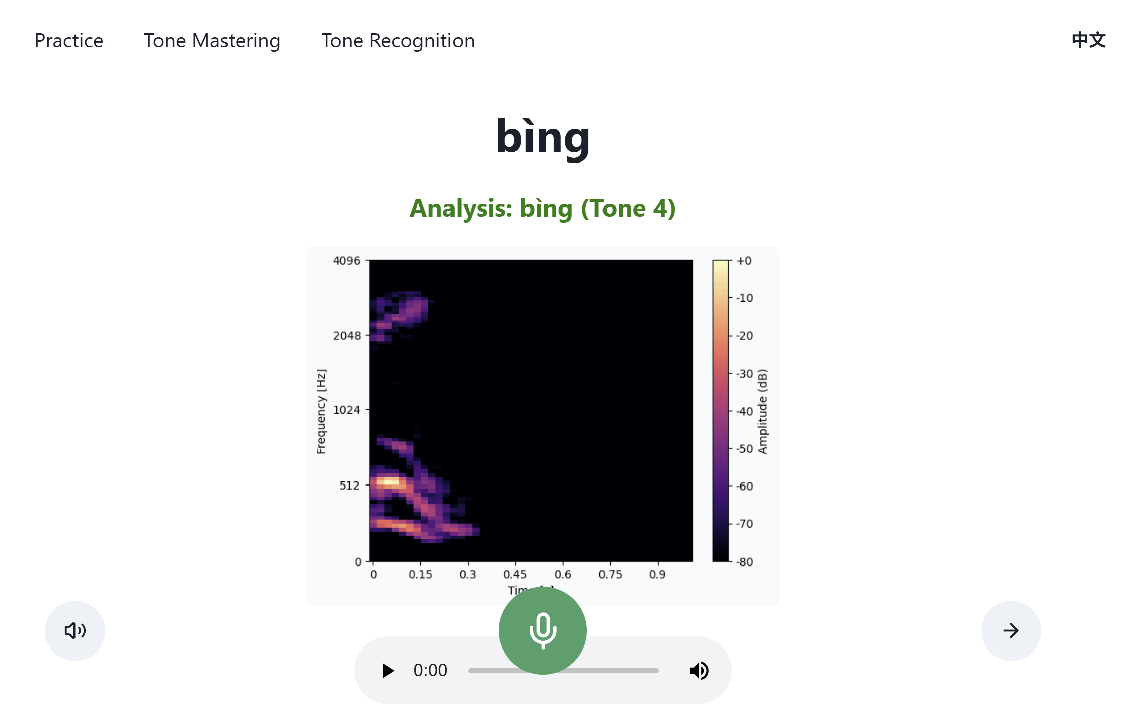 After you record yourself saying the word, you will get feedback on how you did. The analysis will be green if you said the word correctly! You will also see a spectrogram, which allows you to visualize the tone of your speech. In the graph below, you can see how the tone visibly drops for a falling tone.
