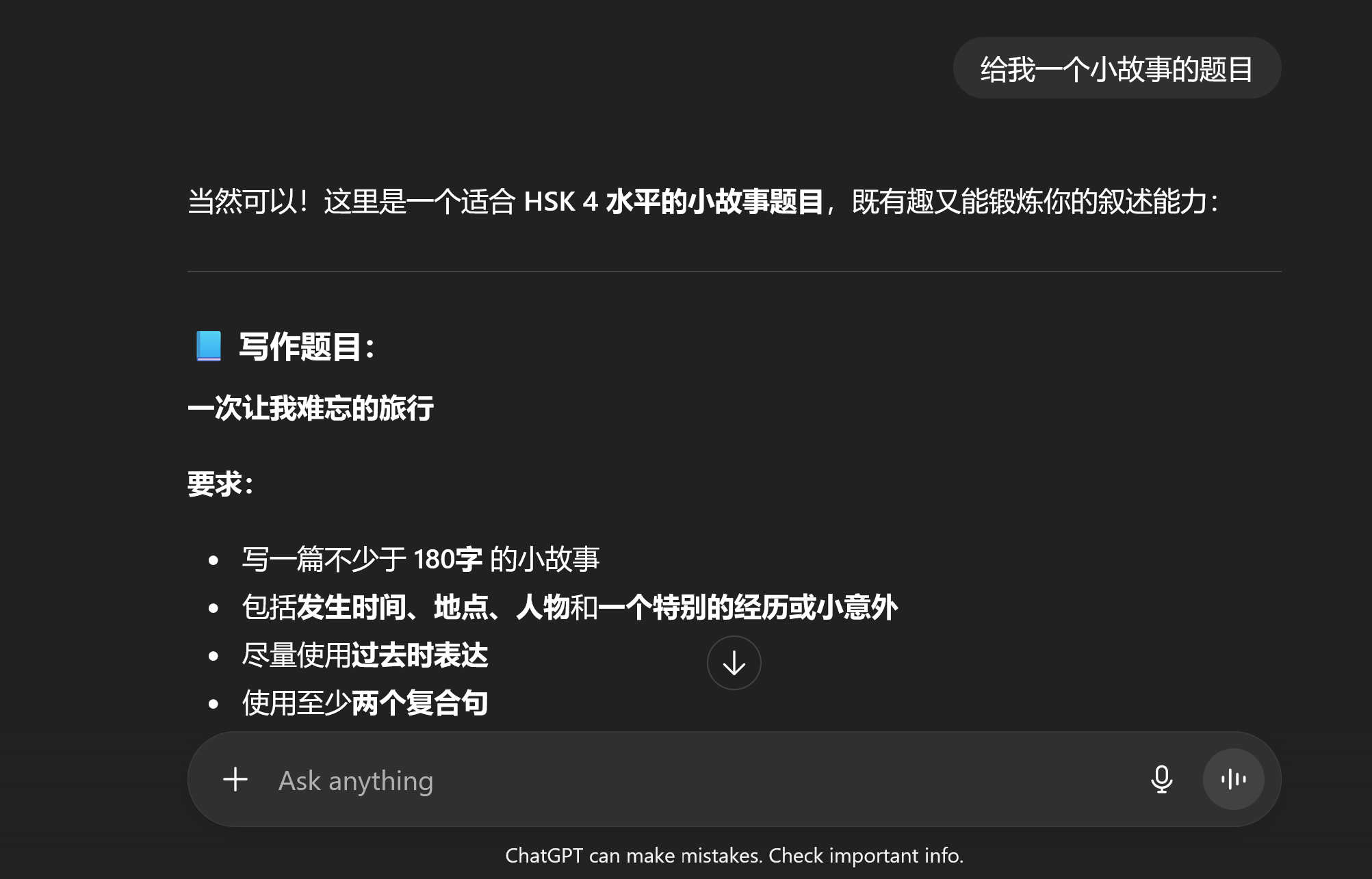 To get started, create a new chat and ask ChatGPT to give you a topic for your Chinese level. In the image below, I asked for an HSK 4 short story topic. Additionally, I prefer to ask questions in my target language, so I get as much immersion as possible, but you can ask for ideas or feedback in any language!