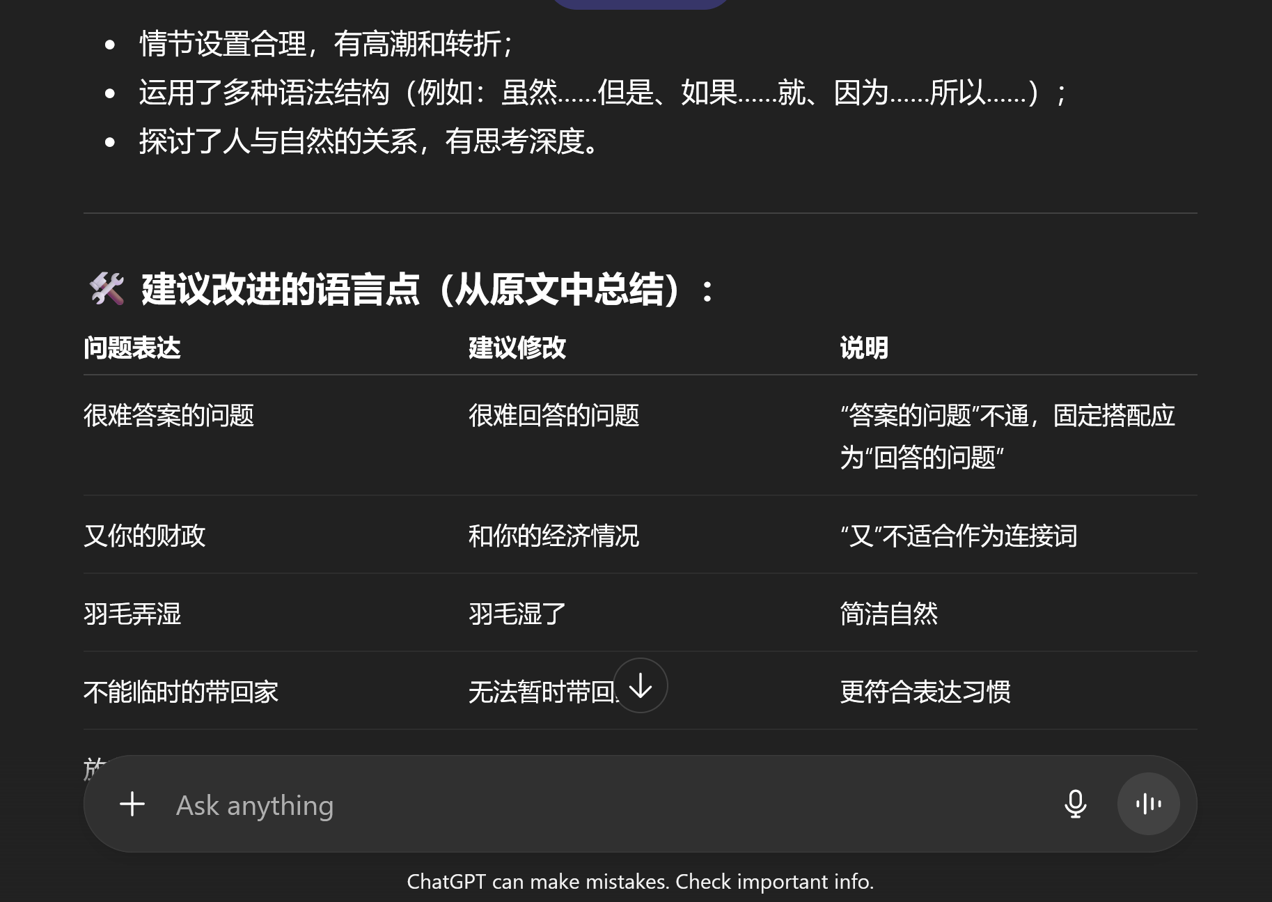 Once you’re done writing your letter, you’re going to put it into ChatGPT and ask it to correct what you wrote so it sounds natural. It’s important to ask ChatGPT to make it sound natural because it tends to make your writing sound stiff and formal if you don’t. To ask ChatGPT to correct your writing in Chinese, you will write, “请将这翻译成自然流畅的中文.” Then copy the text you’ve written into the chat box and press send. It will immediately send you the corrected version of your writing. If you would like it to explain the changes it made, you can write “请解释一下这个语法.” If the Chinese explanation is too difficult, you can also ask it to explain the grammar in English.