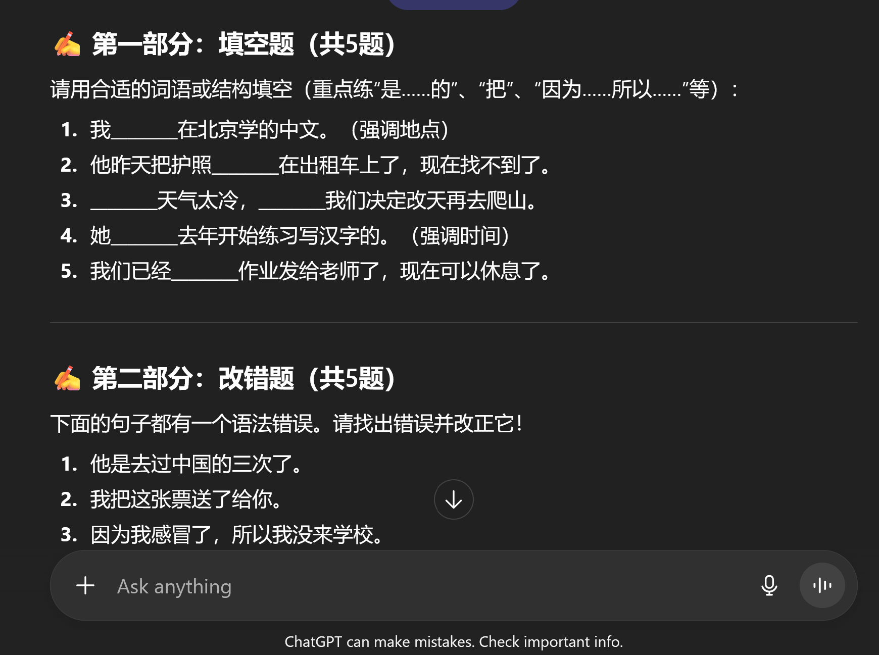 Writing is a great way to practice using the Chinese you’ve learned without the time pressure of speaking. If you feel comfortable reading Chinese at an intermediate level or above, you are ready to start writing! While the best feedback generally comes from native speakers, ChatGPT is a great way to practice and get feedback on your writing for free! ChatGPT can provide you with prompts and examples, correct your mistakes, and offer targeted feedback and practice.