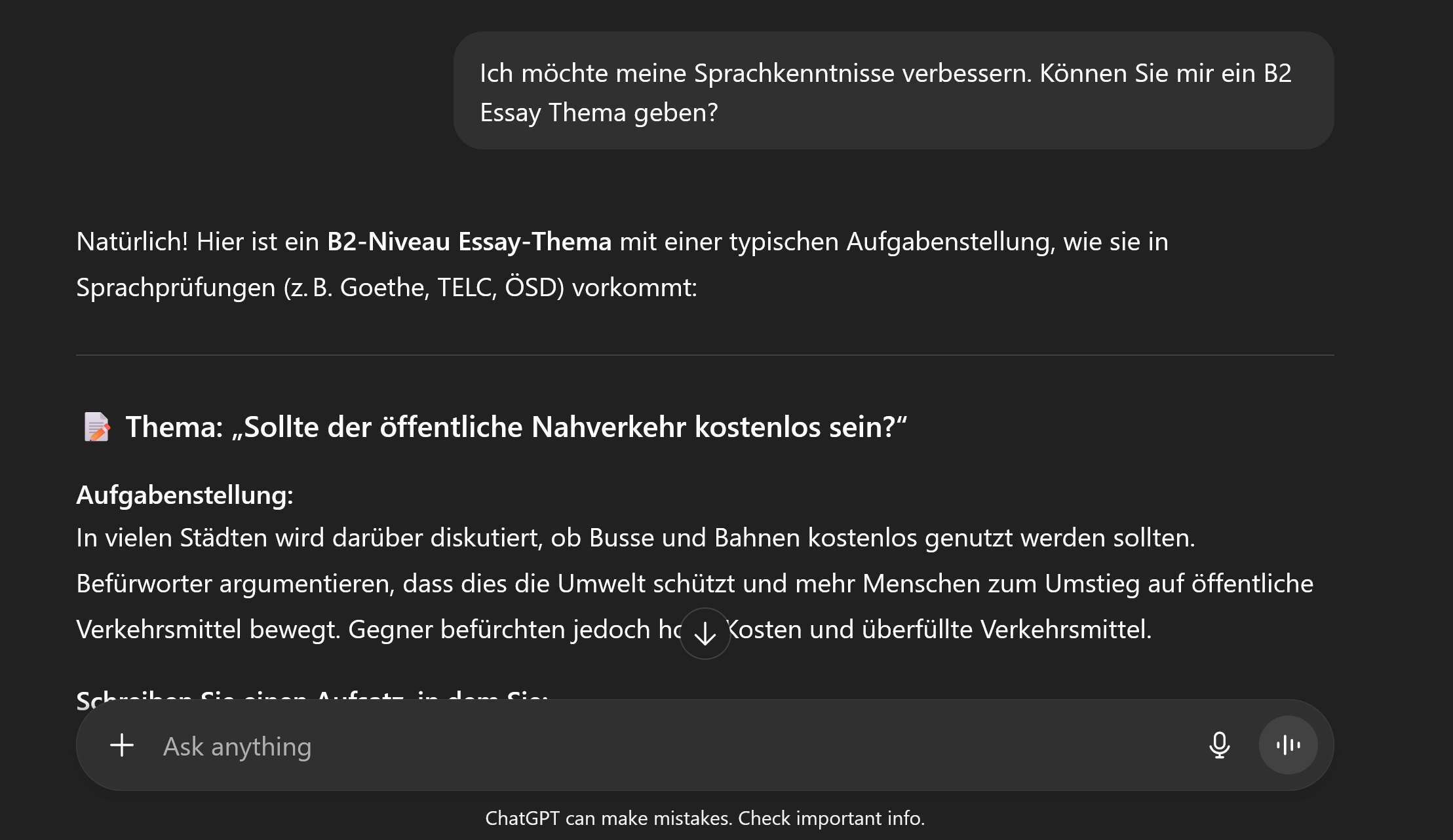 To get started, create a new chat and ask ChatGPT to give you a topic for your German level. In the image below, I asked for a B2 essay topic. Additionally, I prefer to ask questions in my target language, so I get as much immersion as possible, but you can ask for ideas or feedback in any language!