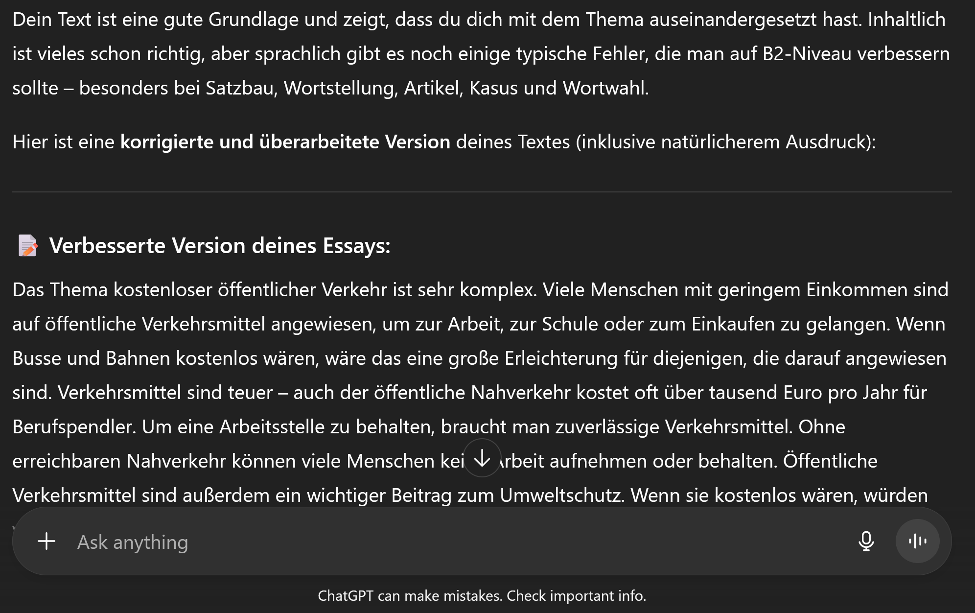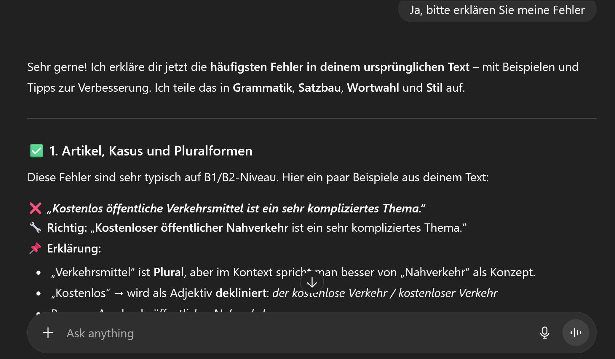 Once the post is done, put it into ChatGPT and ask it to correct the writing so it sounds natural. It’s important to ask ChatGPT to make it sound natural because it tends to make your writing sound stiff and formal if you don’t. To ask ChatGPT to correct your writing in German, write, “Bitte korrigieren Sie dies, damit es natürlich klingt,” then copy the text you’ve written into the chat box and press send. It will immediately send you the corrected version of your writing. If you would like it to explain the changes it made, you can write “Bitte erkläre meine Grammatikfehler.” If the German explanation is too difficult, you can also ask it to explain your grammar mistakes in English.