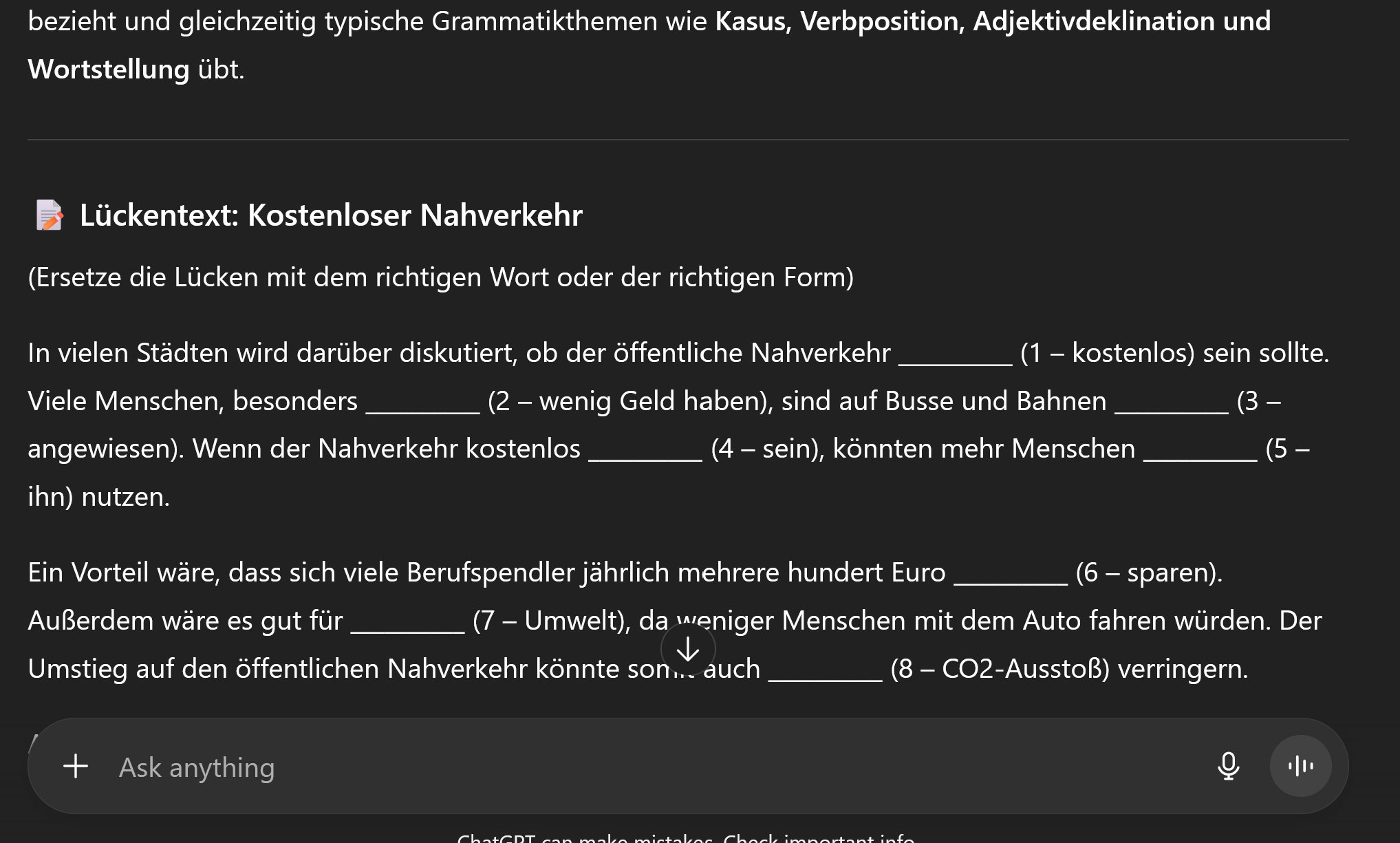 If you’re really not sure how to phrase something, and Reverso isn’t helping, you can go to ChatGPT and ask it how to say what you’re looking for. ChatGPT is extremely useful, but it needs to be used as a tool, not as a translator. If you rely on it too much to translate everything for you, your German will not improve. You should only use ChatGPT for support; don’t copy anything directly.