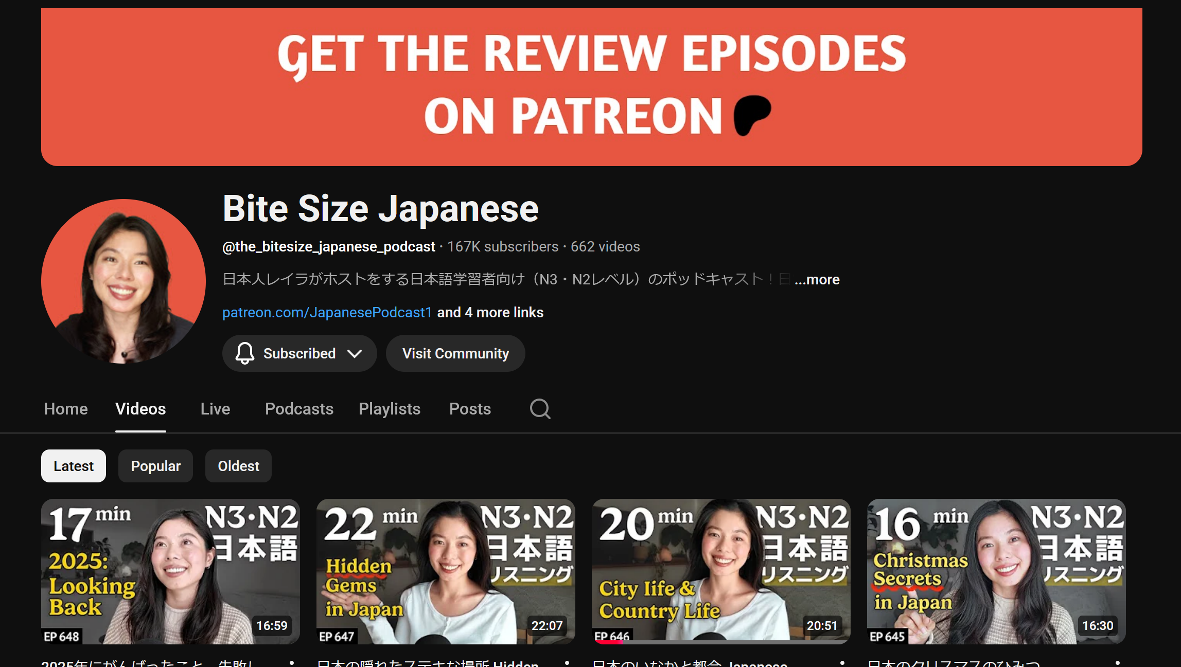 Misa has a large library of grammar and vocabulary explanation videos, as well as listening practice videos. Her content offers English support and translations, so they are great for beginners.